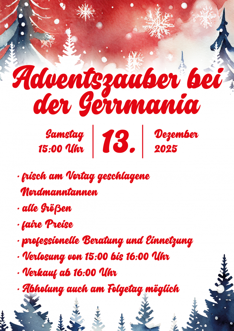 Am Samstag wird die Germania beim Adventszauber frisch geschlagene Nordmanntannen verlosen und verkaufen. Das ganze im vorweihnachtlichen Ambiente. Wir freuen uns auf Euren Besuch.